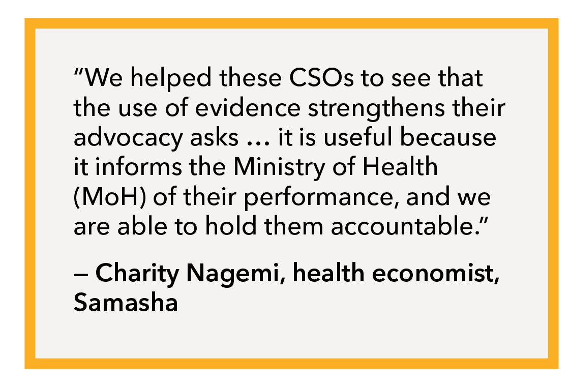 According to Wezi Mjojo, once MANASO started budget tracking, it not only found that the amount allocated for FP commodities was increased only minimally each year, but that the allocation as a percentage of the funding need had actually declined. After MANASO organized coalition meetings with MoH and Ministry of Finance (MoF) officials, the MoH increased the commodities allocation by 125% in FY 2019/20. During the FY 2020/21 budget formulation, a decision was made to decrease the commodities allocation by 10 million Malawian kwacha (nearly $10,000) due to the need to divert funding to the COVID-19 response. MANASO and the coalition mobilized, and their advocacy resulted in a 9% increase in the FP commodities budget for FY 2020/21.